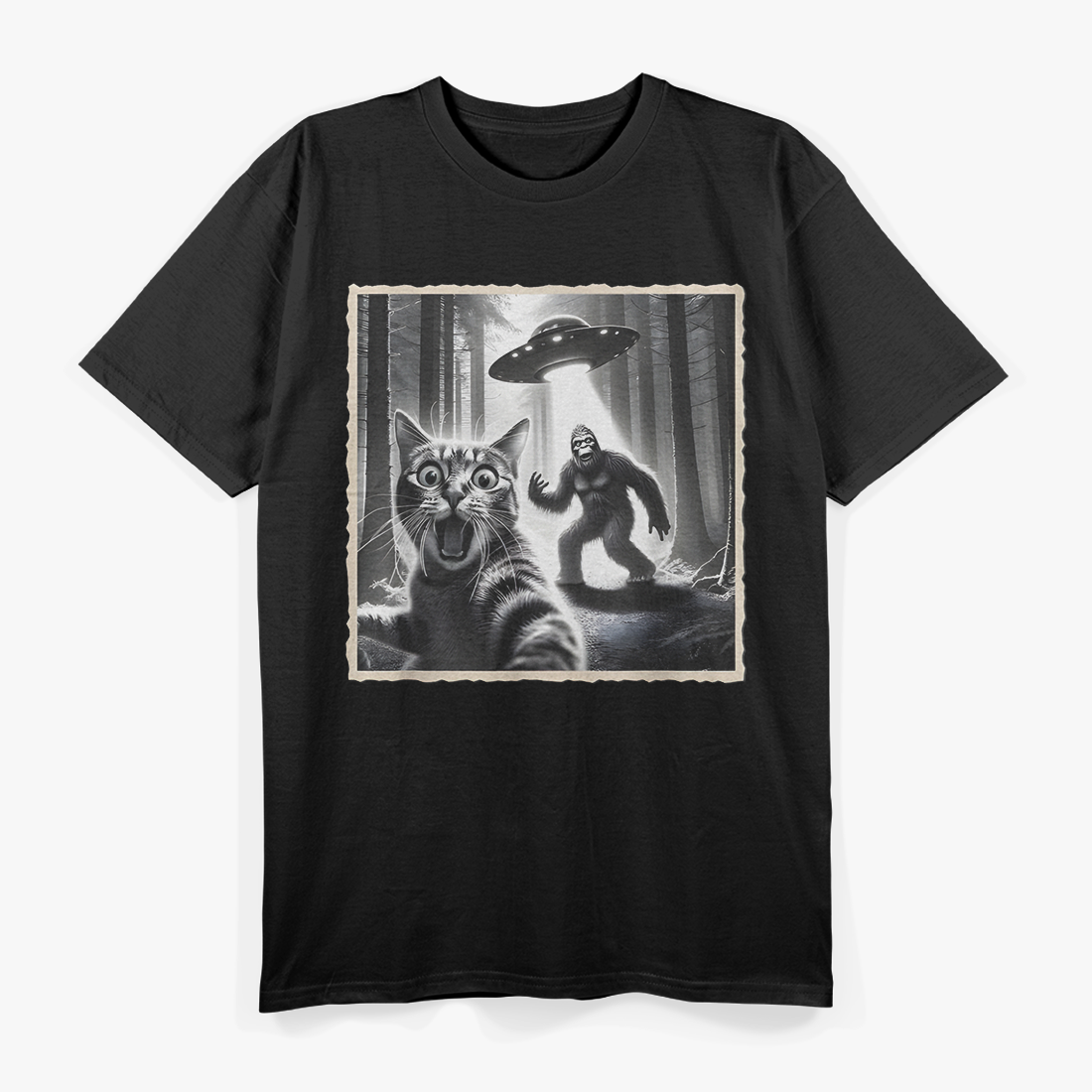 A hilarious trio of chaos — Bigfoot posing, a UFO hovering, and a cat stealing the spotlight. Perfect for cryptid fans, meme lovers, and anyone who enjoys absurd paranormal humor.