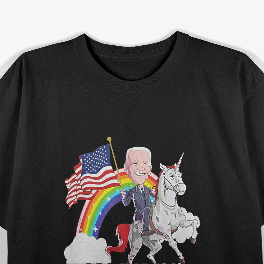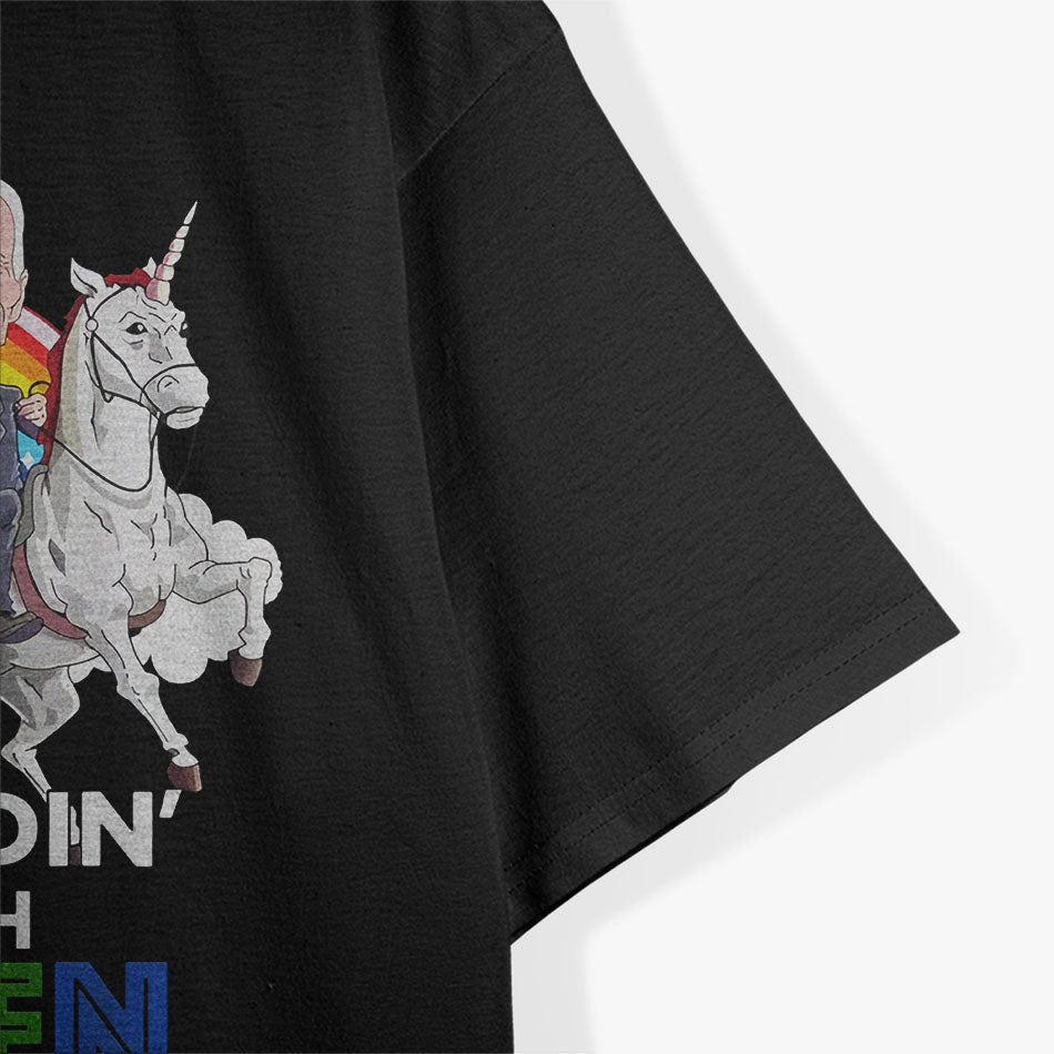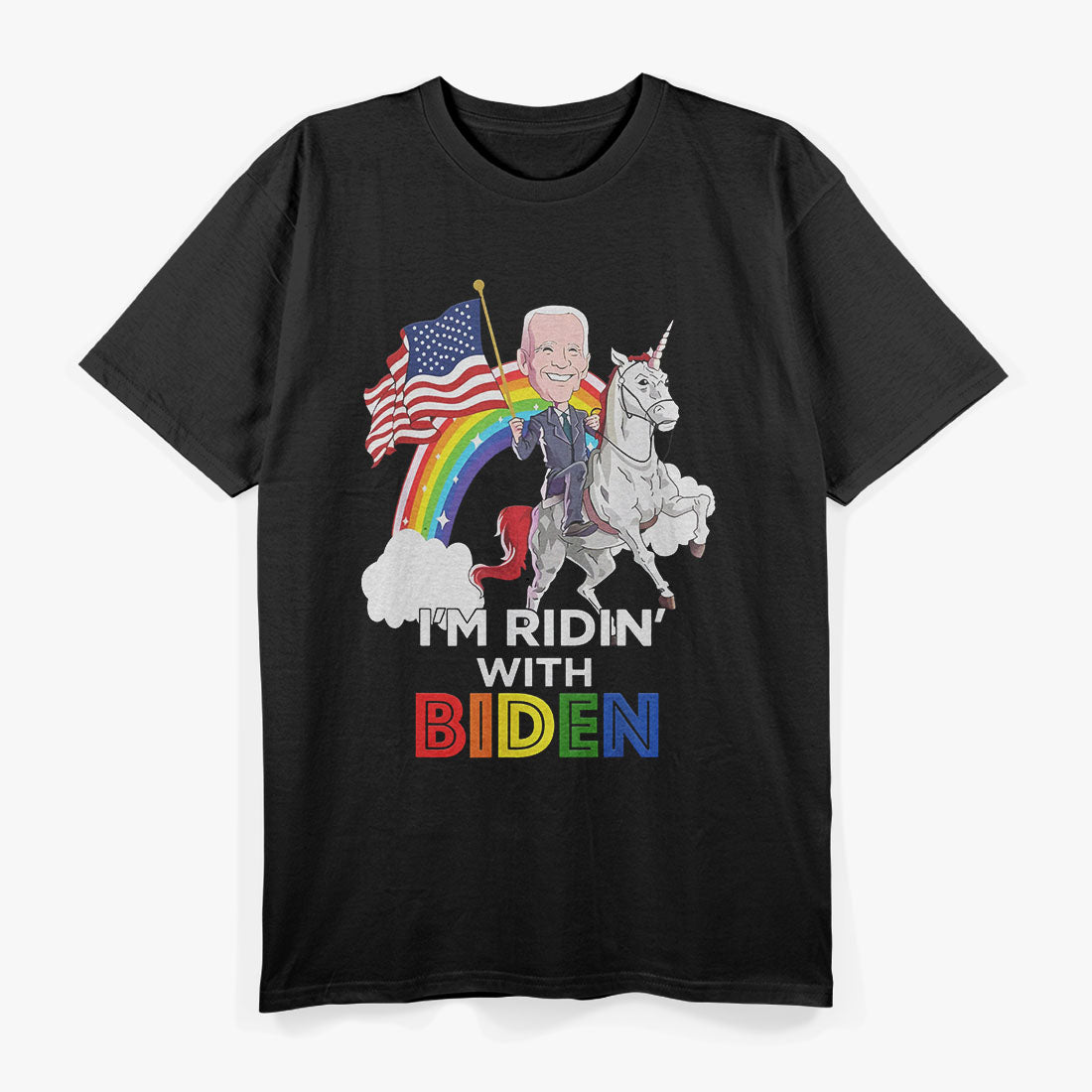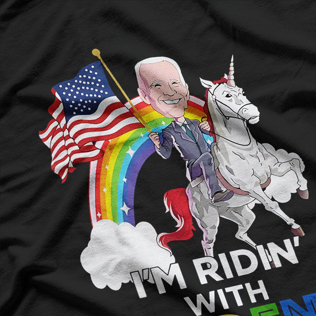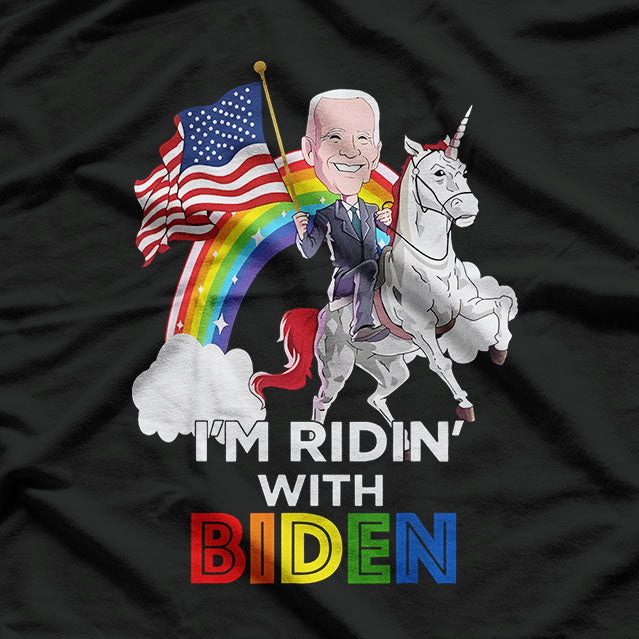 Ridin' with Biden American Flag and Rainbow Unicorn Fun T-Shirt